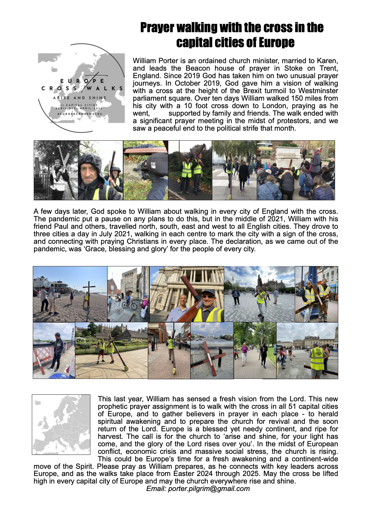 Having been led by God to walk with a cross from Stoke on Trent to London in 2019, then in all cities of England in 2021, I am now planning a new prayer mission in Europe. I feel stirred in faith to travel to all capital cities in Europe – 51 cities – to meet Christians there and to pray for spiritual awakening across this continent. This will take place between Easter 2024 and Easter 2025, in monthly trips out to a cluster of cities each time. I am building up prayer and practical support here at home, and starting to connect with key contacts and friendship links in all these cities. I will keep updating progress here and on social media.